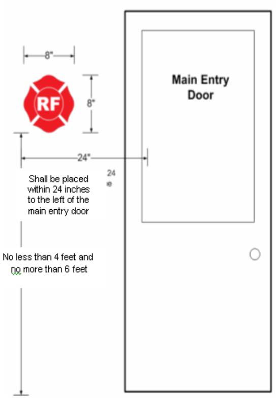 Where do I place the symbol? The approved symbol shall be placed within 24 inches to the left of the main entry door. The distance above the grade, walking surface or the finished floor to the bottom of the symbol shall not be less than 4 feet (48 inches). The distance above the grade, walking surface or the finished floor to the top of the symbol shall not be more than 6 feet (72 inches). The Maltese Cross sign shall be permanently attached to the face of the structure on a contrasting background. Additional signs to be installed as determined by the Authority Having Jurisdiction.