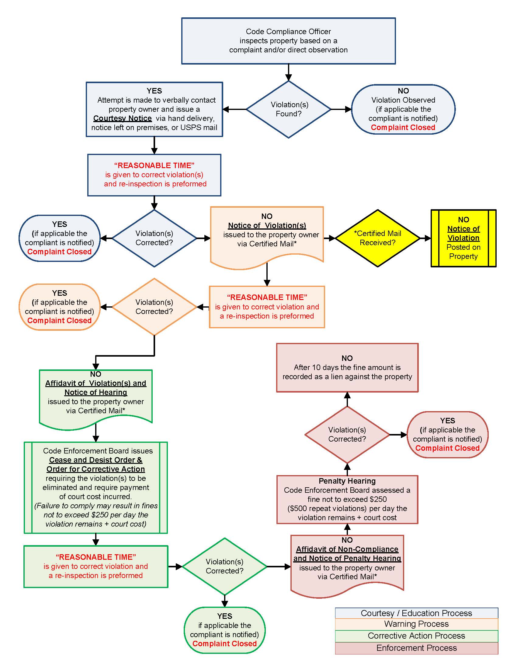 There are times when voluntary compliance is not achieved. When informal and formal efforts fail to get compliance, the Code Compliance Officer will initiate an appropriate progressive enforcement step. Depending on the violation, this might include issuing a “Notice of Violation” or Statement of Violation and Notice of Hearing requiring the responsible party’s appearance before the Code Enforcement Board.